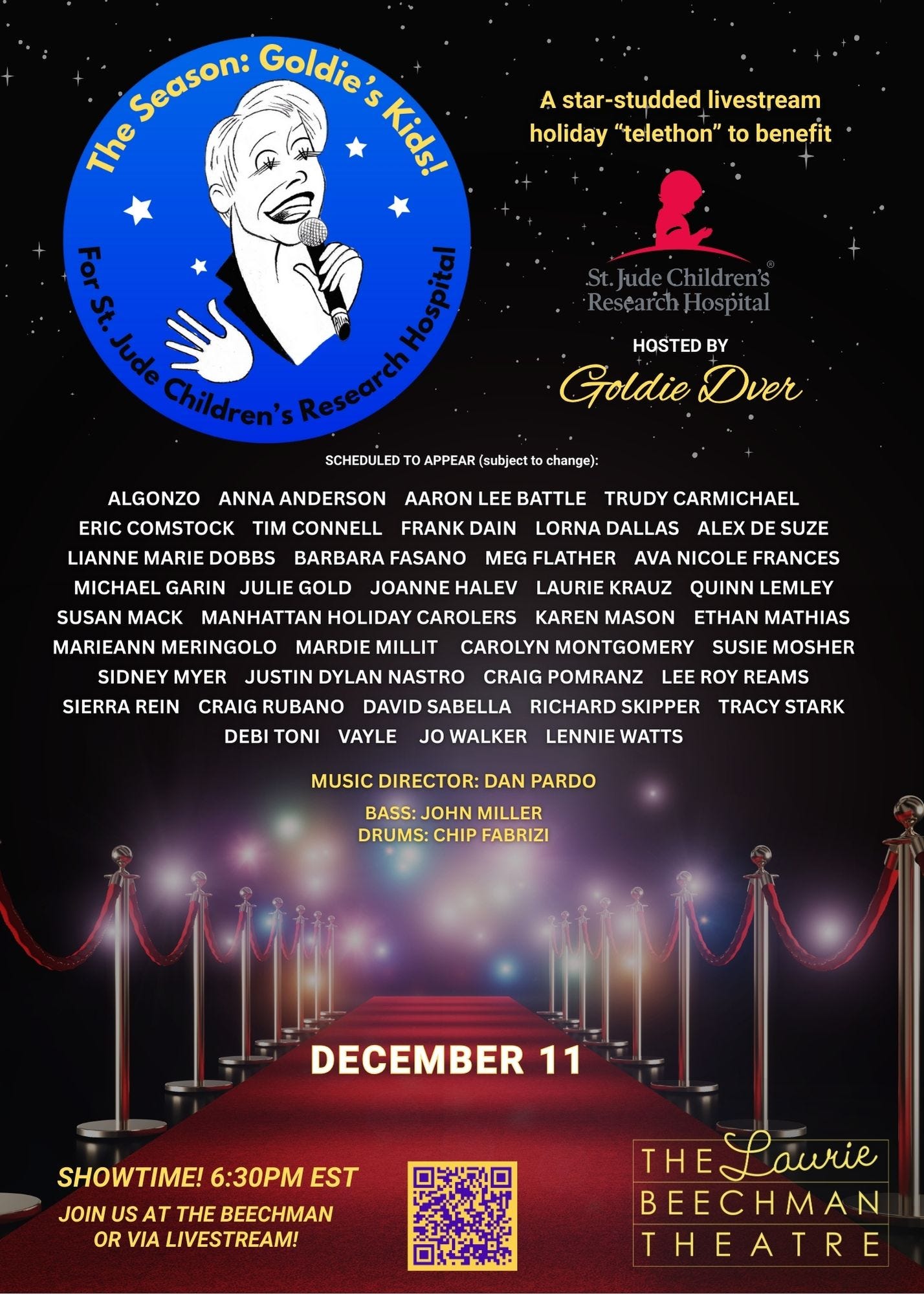 Next Thursday, December 11, over 30 of New York’s most dazzling stars from Broadway, cabaret, and jazz take the stage with The Season: Goldie’s Kids! Performed at the beautiful Laurie Beechman Theatre in New York, our homage to the legendary Jerry Lewis MDA telethons will be live-streamed as well! Check out the incredible lineup of talent (below)! I am honored to be directing this incredible event, all proceeds from which will benefit the children of St. Jude and their families as they battle childhood cancer and other diseases.